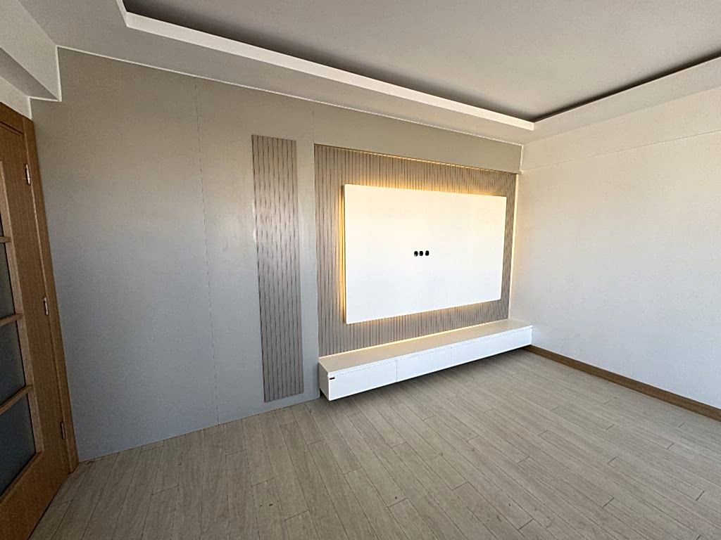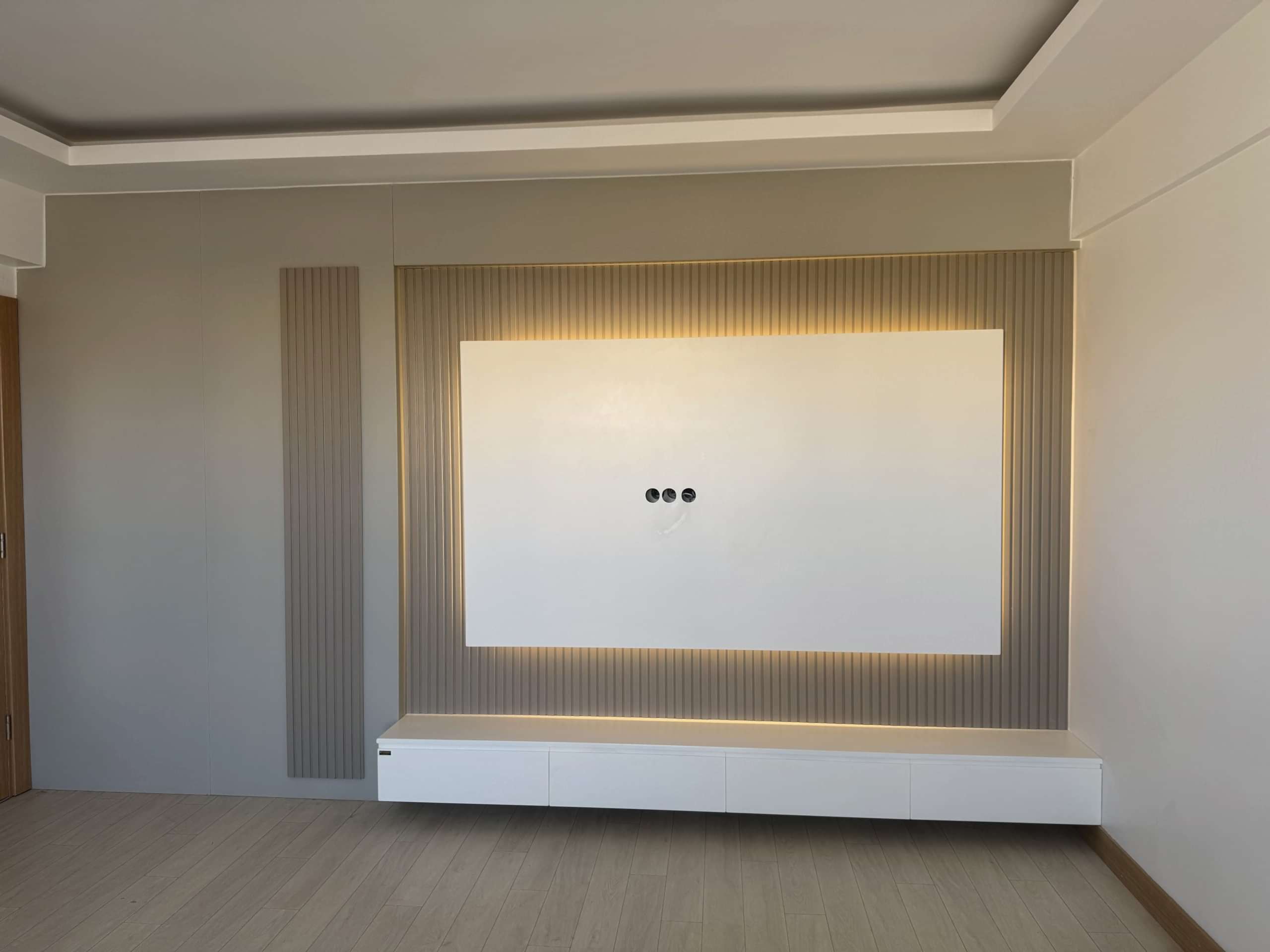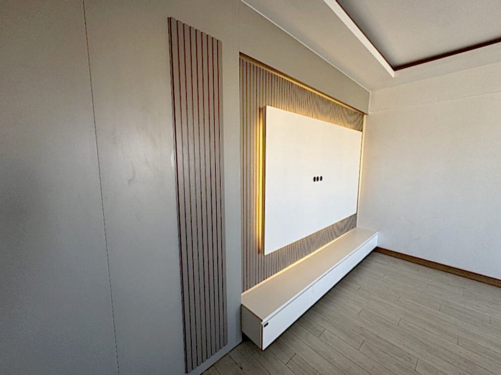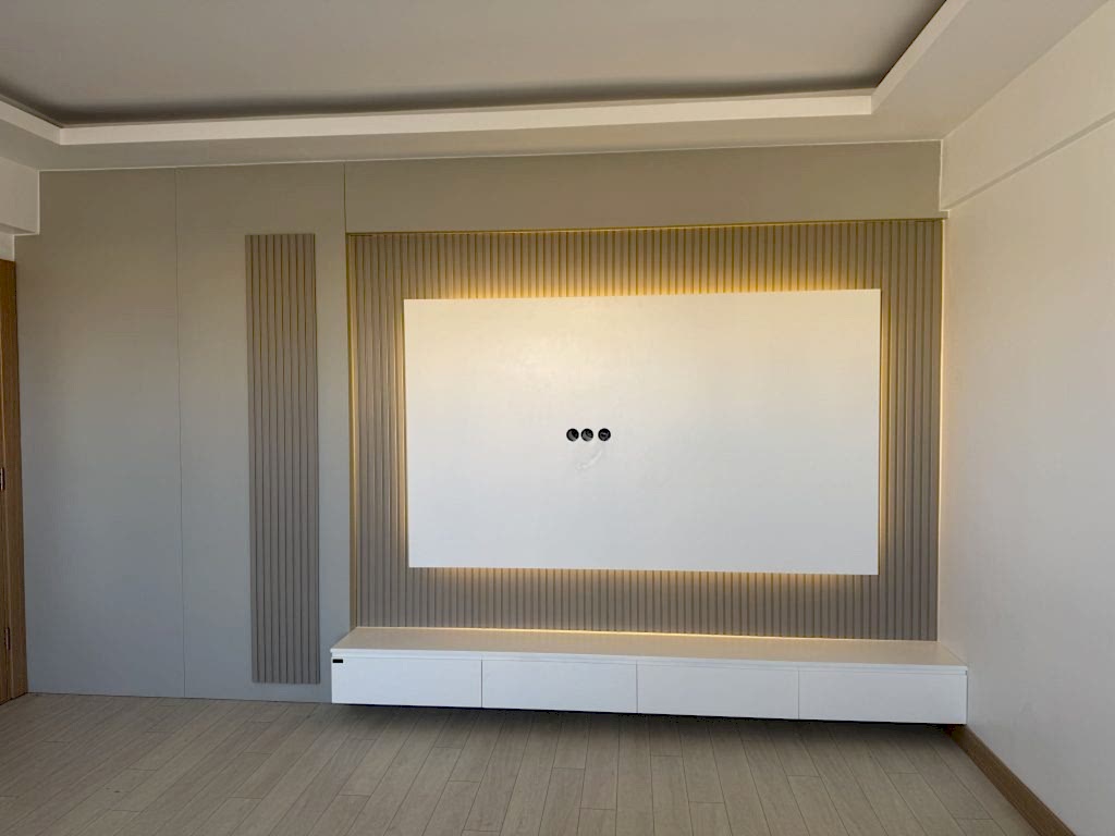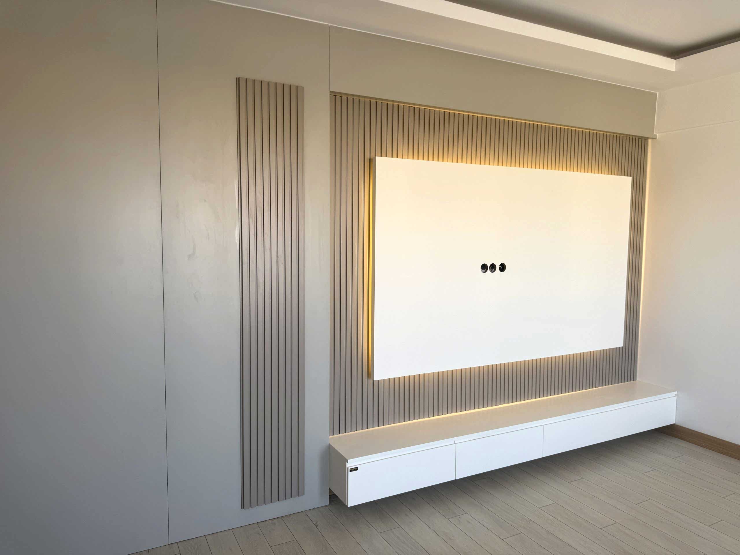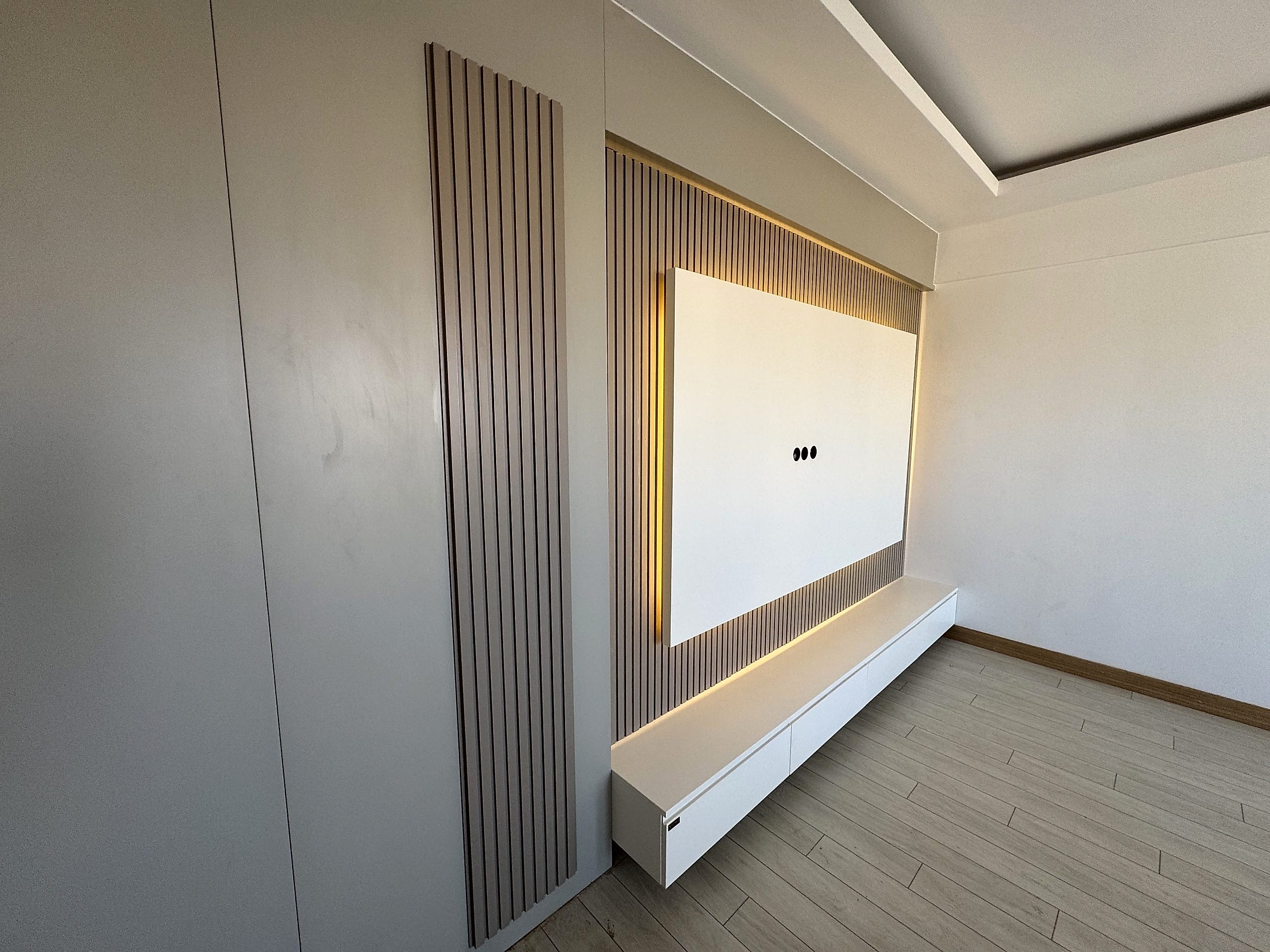 TV asılacak duvar, tamamen lake boyalı mobilya ile giydirilerek mekâna zarif bir görünüm kazandırıldı. Bu özel tasarımı daha da öne çıkarmak ve görsel çeşitliliği artırmak adına, TV arkasında ve kolonun bir kısmında ambiyans ışıklandırması uygulandı. Böylece, modern ve sofistike bir atmosfer yaratarak odanın genel estetiğine güçlü bir katkı sağladık.