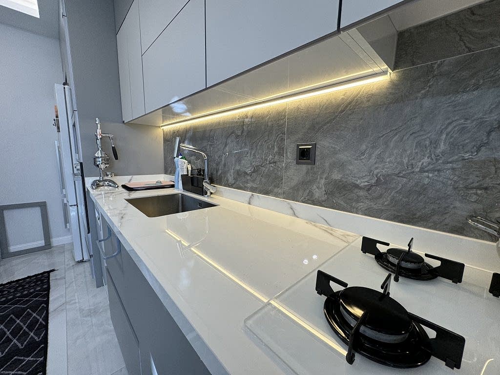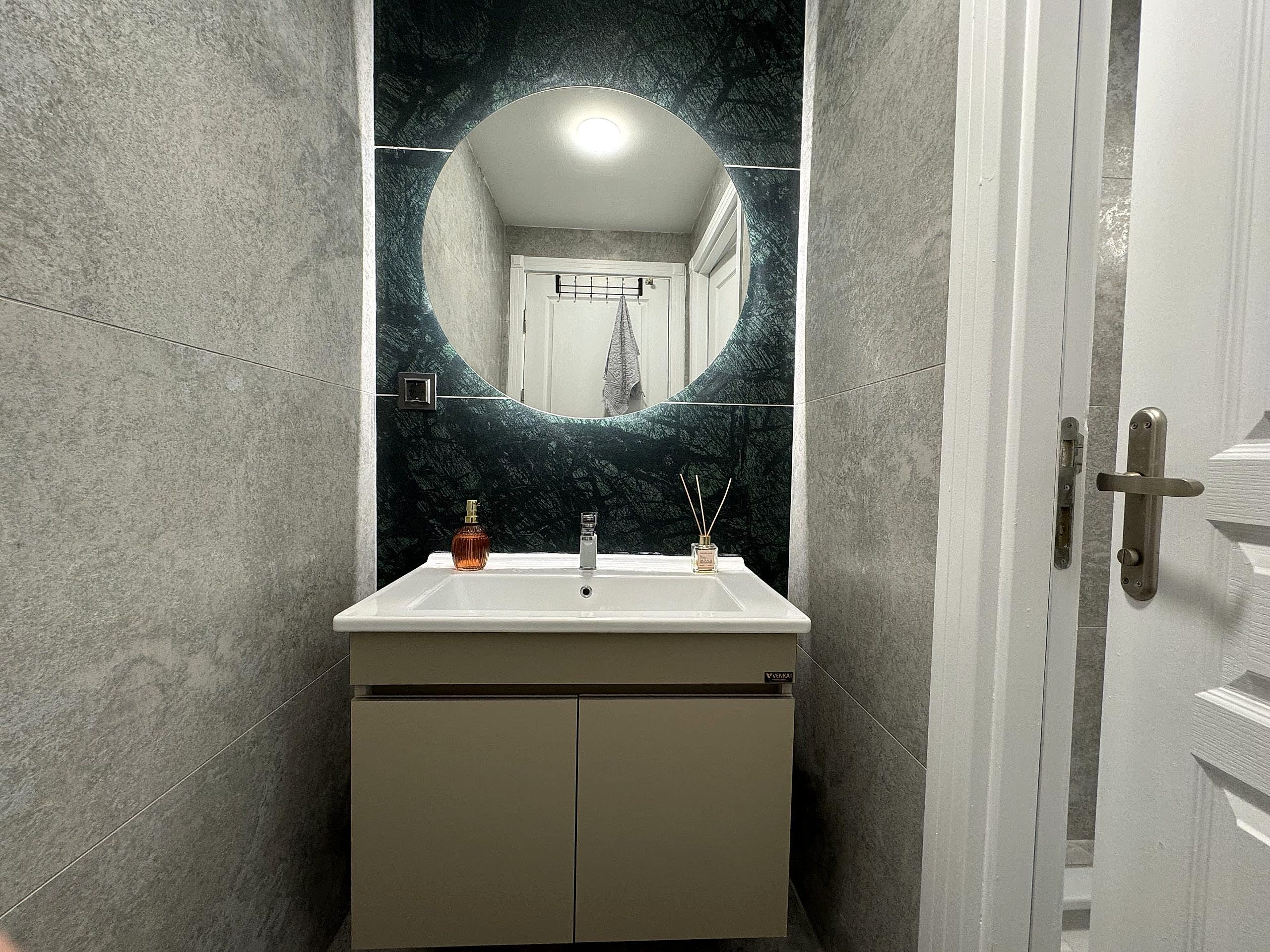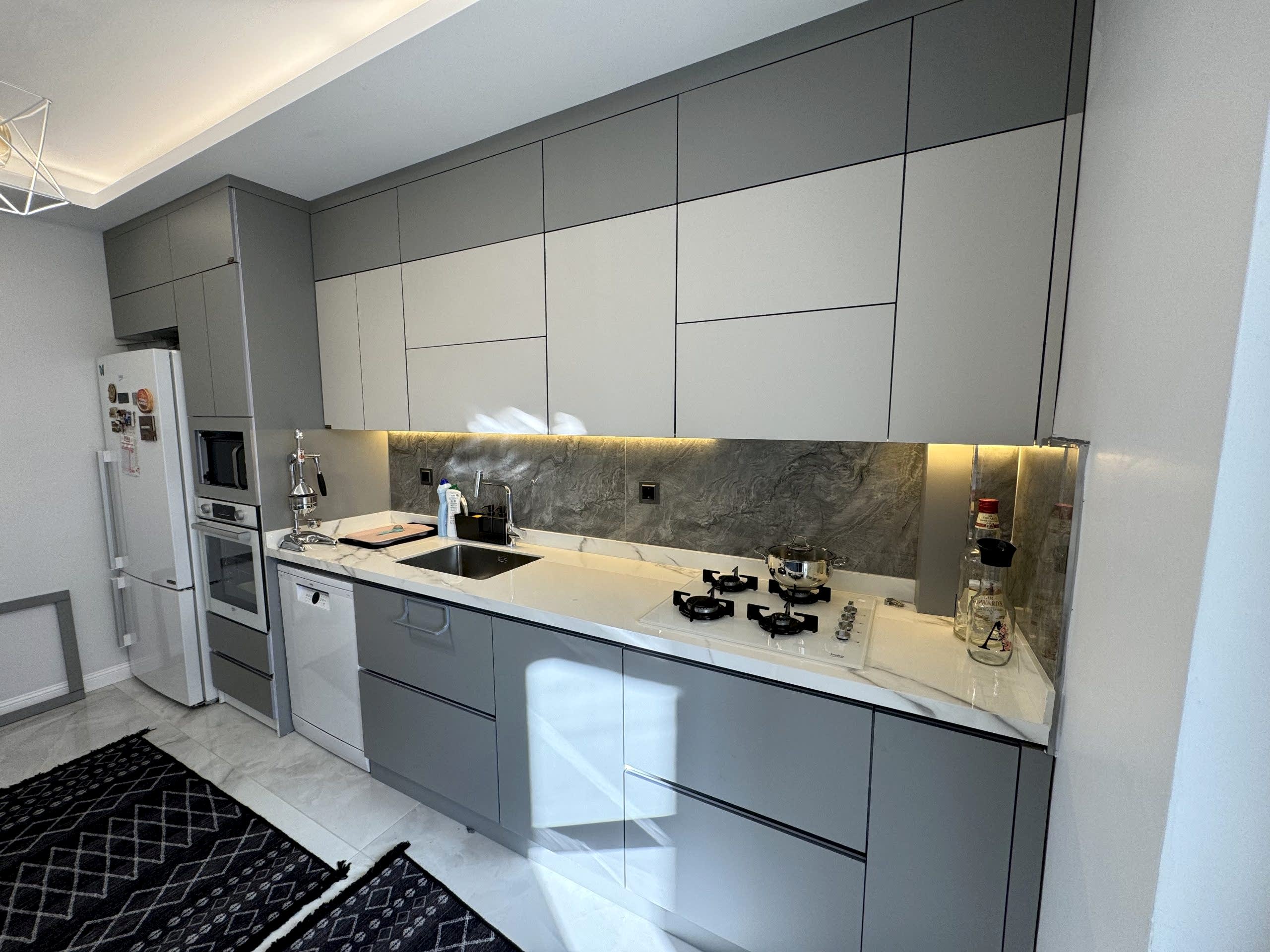 Bu projede mutfak, antre ve banyoda kullanılan tüm mobilya ve malzemeler, birbirleriyle uyumlu olacak şekilde tasarlanıp uygulandı. Proje boyunca, ergonomi, kullanışlılık ve malzeme kalitesi her zamanki gibi önceliğimiz oldu.