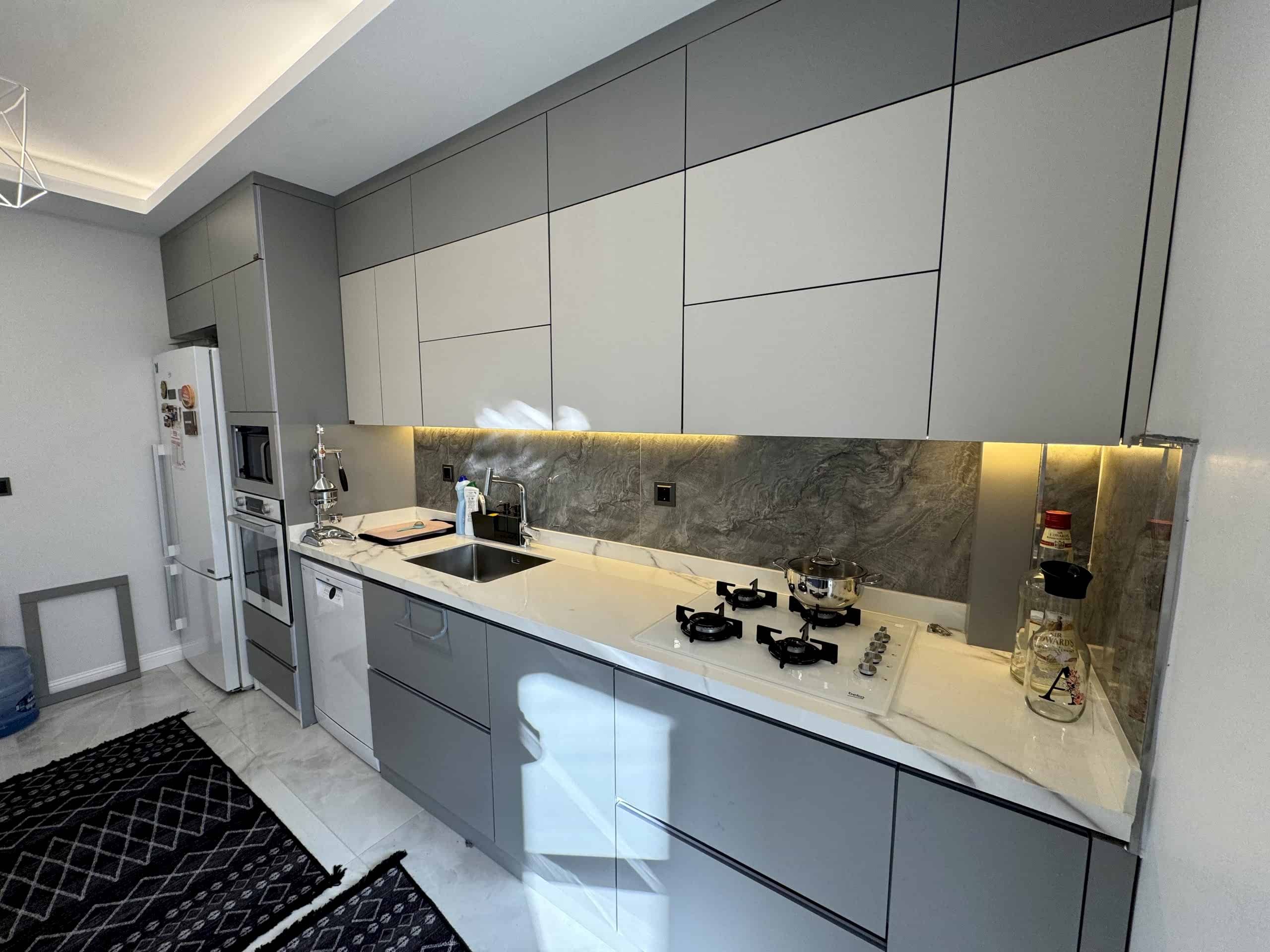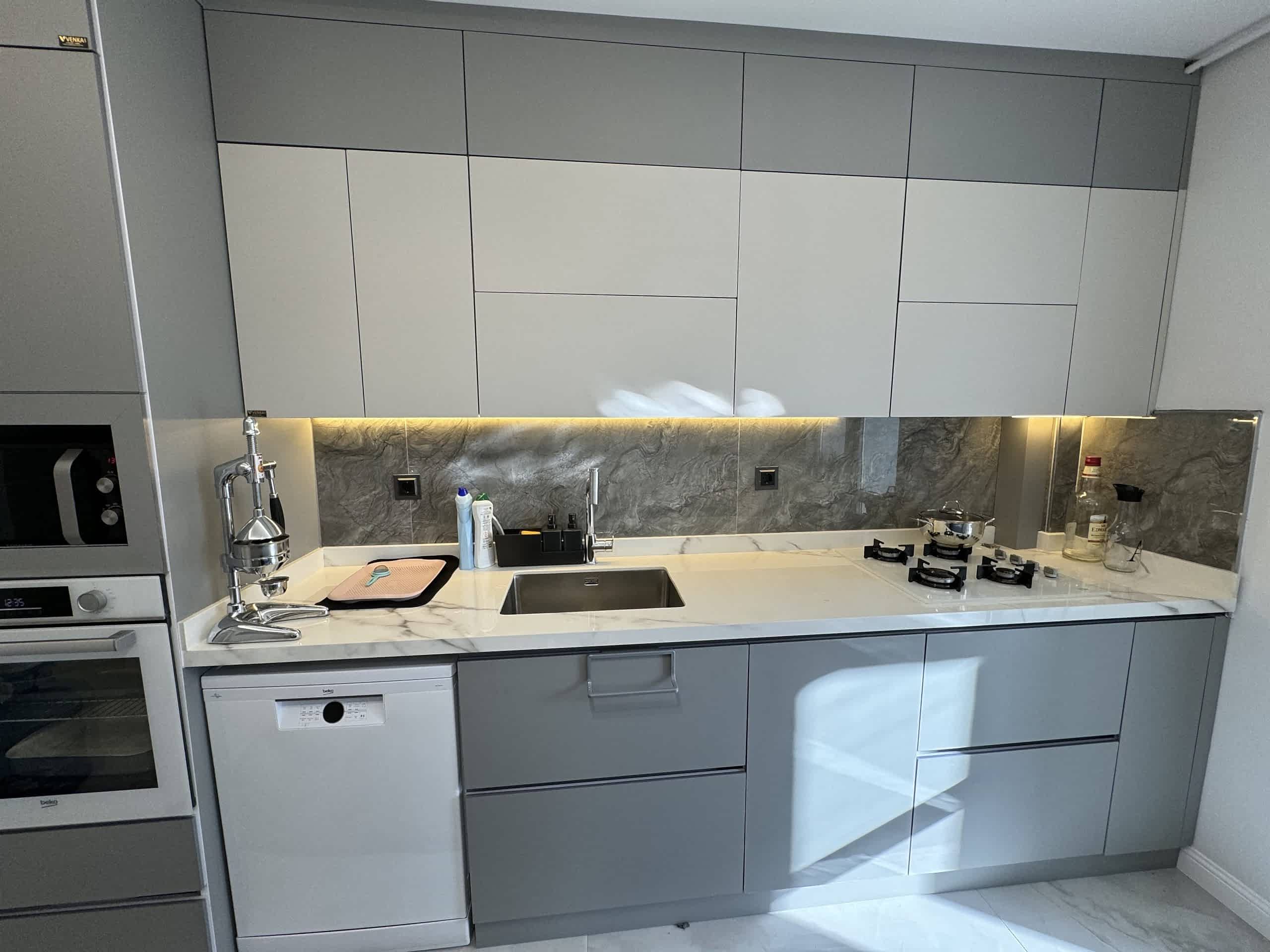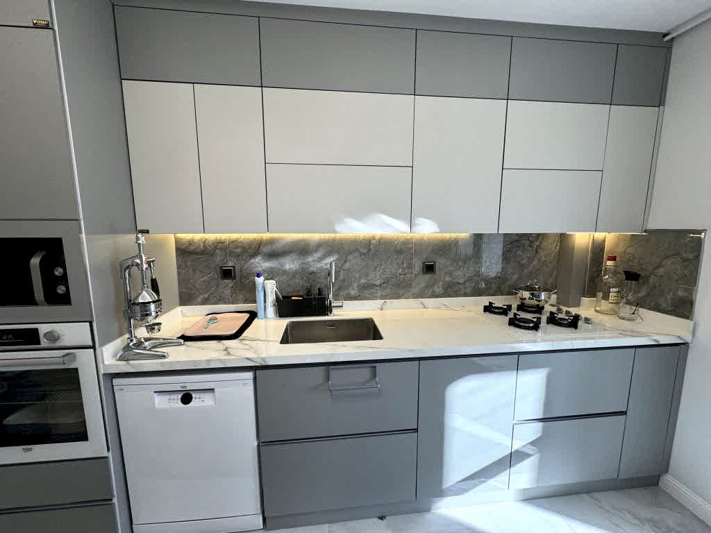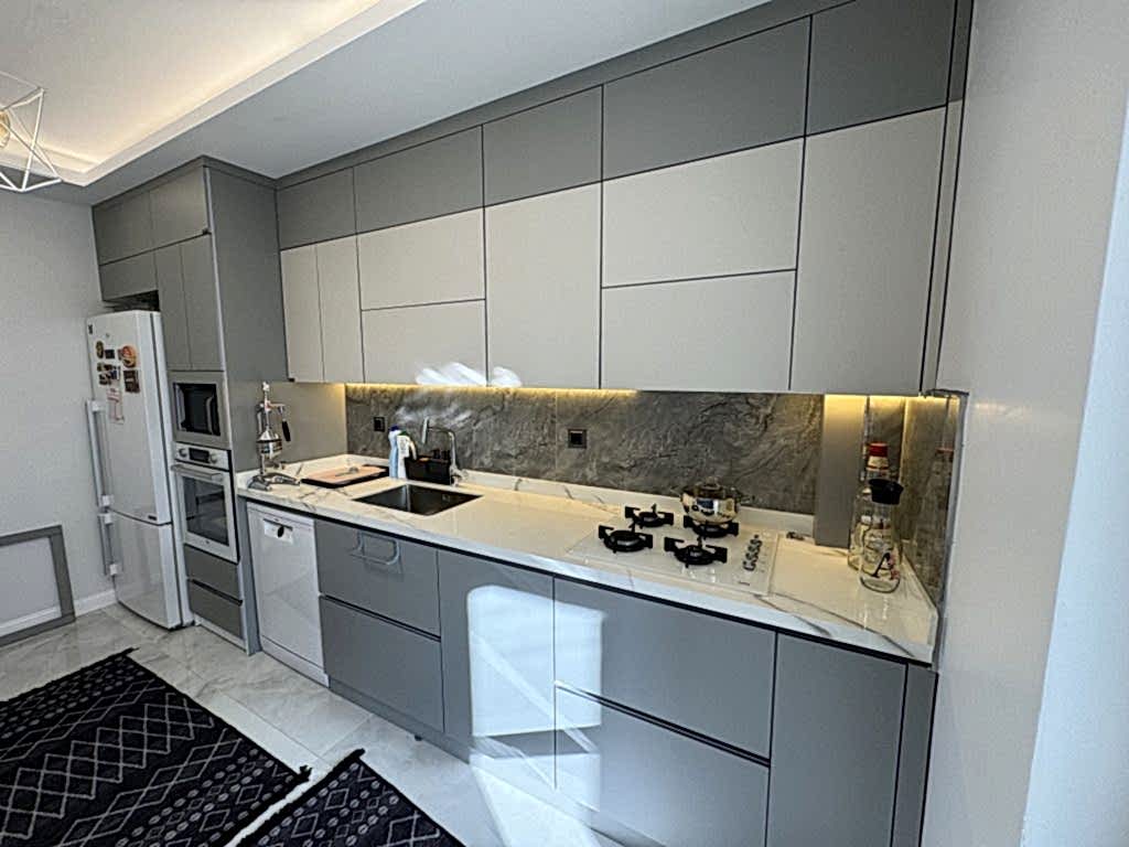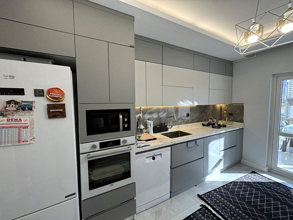 Projede kullanılan mutfak mobilyaları, ipeksi mat malzemeden üretilerek zarif bir dokunuş kazandırıldı. Mutfak dolapları, hem estetik hem de uzun ömürlü bir kullanım sunacak şekilde tasarlandı. Ergonomik yapısıyla dikkat çeken bu alan, günlük kullanımda maksimum rahatlık sağlıyor.
