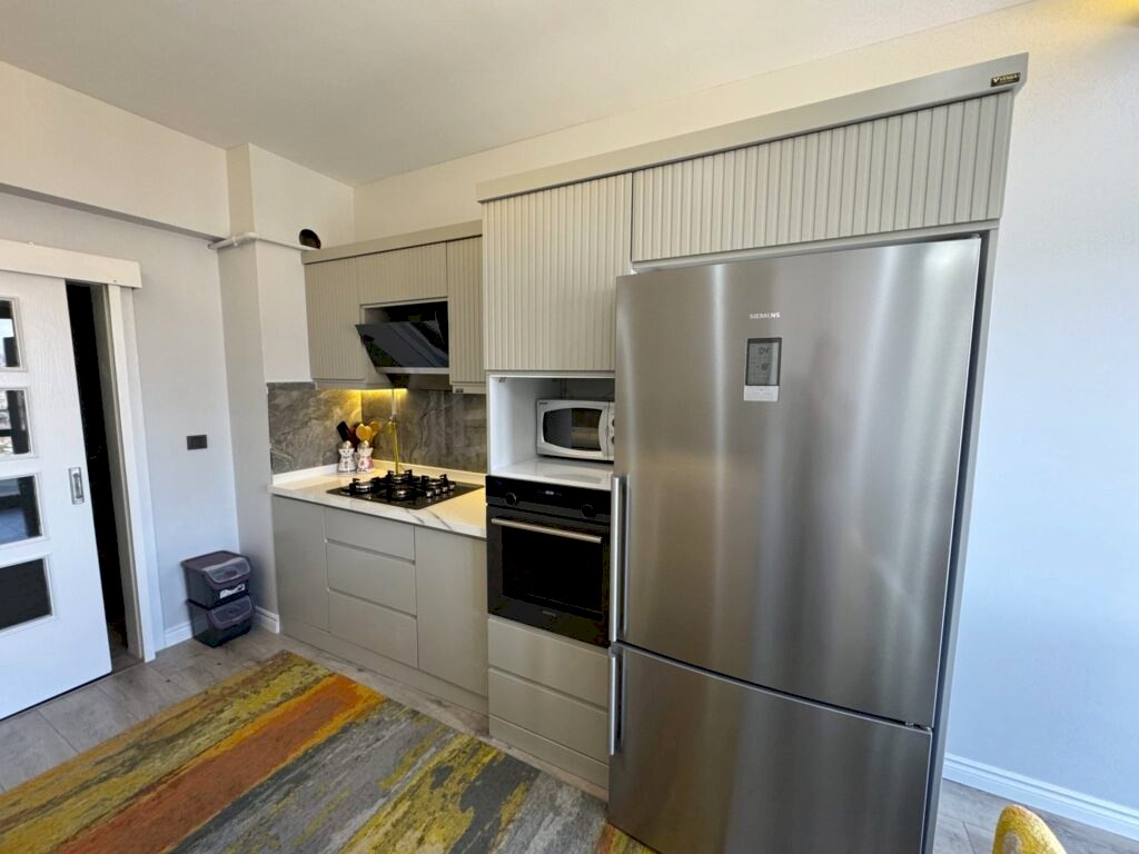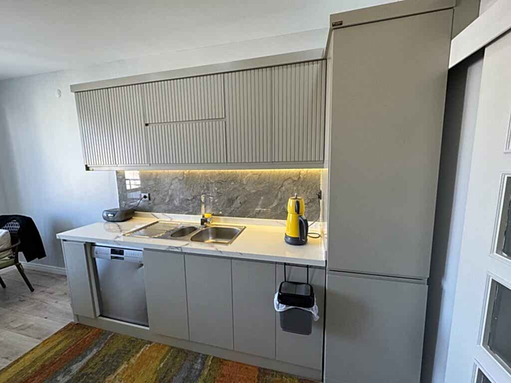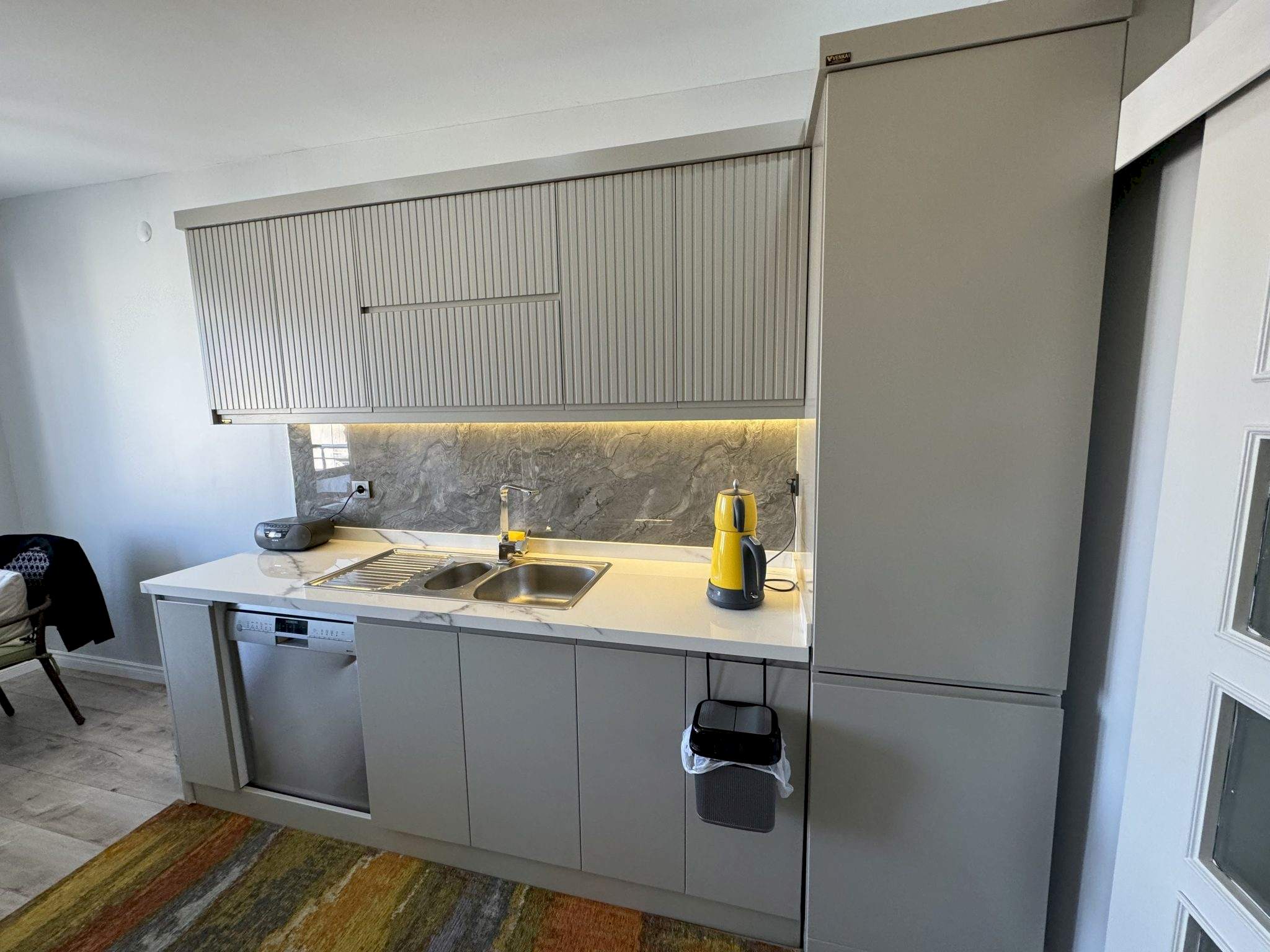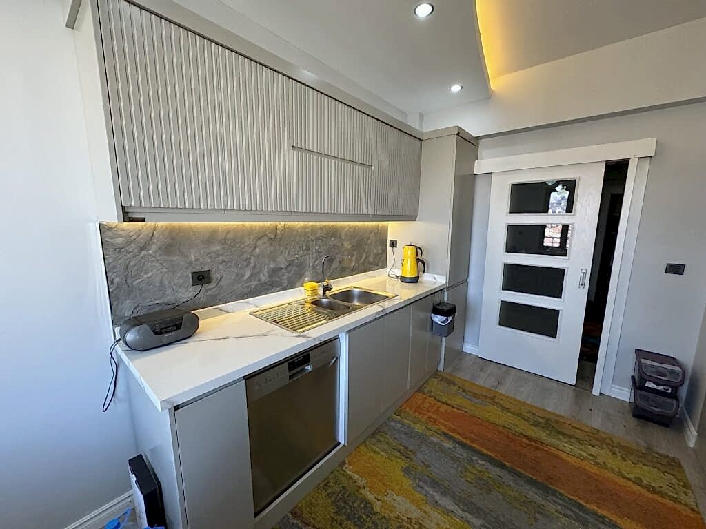 Tezgah ve Aydınlatma: Mutfak tezgahında, son yılların en şık ve dayanıklı malzemesi olarak bilinen porselen tercih edildi. Porselen mutfak tezgahı, estetik görünümünün yanı sıra yüksek dayanıklılığı ile de ön plana çıkmaktadır. Tezgahı aydınlatan ambiyans LED aydınlatmalar, mutfağa modern bir hava katarken, kullanışlılığı da artırdı. Bu aydınlatmalar, hem çalışma alanlarının yeterince aydınlatılmasını sağladı hem de mutfakta sıcak ve davetkâr bir atmosfer oluşturdu.