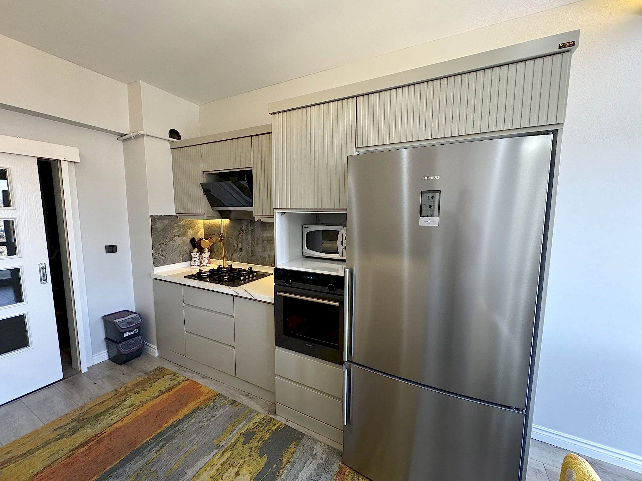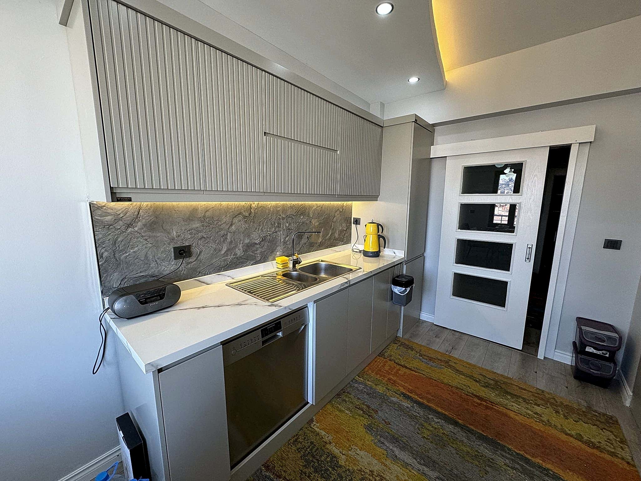 Mobilya Seçimi ve Tasarımı: Mutfak mobilyalarında lake kapaklı mobilyalar tercih edilerek, mekâna zarif bir dokunuş katıldı. Üst kapaklarda CNC lambri modelli kapaklar kullanılırken, alt kapaklar düz tercih edilerek tasarımda hareketli ve sakin unsurların dengeli bir şekilde bir araya gelmesi sağlandı. Bu tasarım yaklaşımı, mutfağın hem dinamik hem de huzur verici bir atmosfere sahip olmasını sağladı.