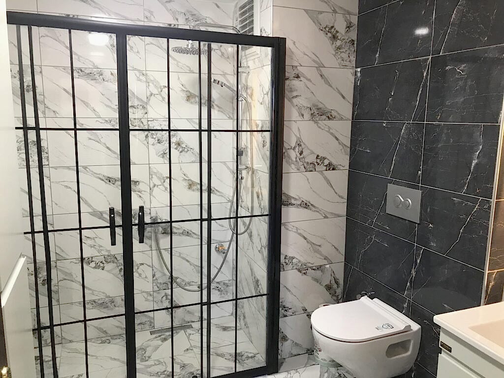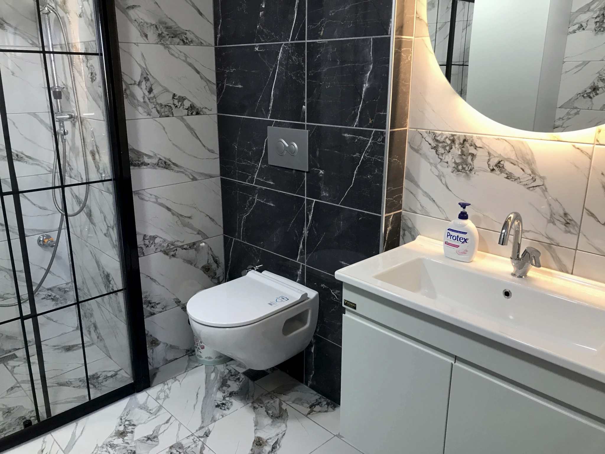 Banyo ve WC tasarımında ise, 30×90 ebatlı duvar seramikleri ile sofistike bir görünüm elde edildi. Eloksal camlı duşakabin ve gömme rezervuarlı klozet kullanımı, banyonun modern ve işlevsel olmasını sağlıyor. Asma lavabo dolabı, mutfak mobilyalarıyla uyumlu renkler ve kapaklarla donatılarak, evin genel tasarım diline uygun bir bütünlük sağlanıyor.