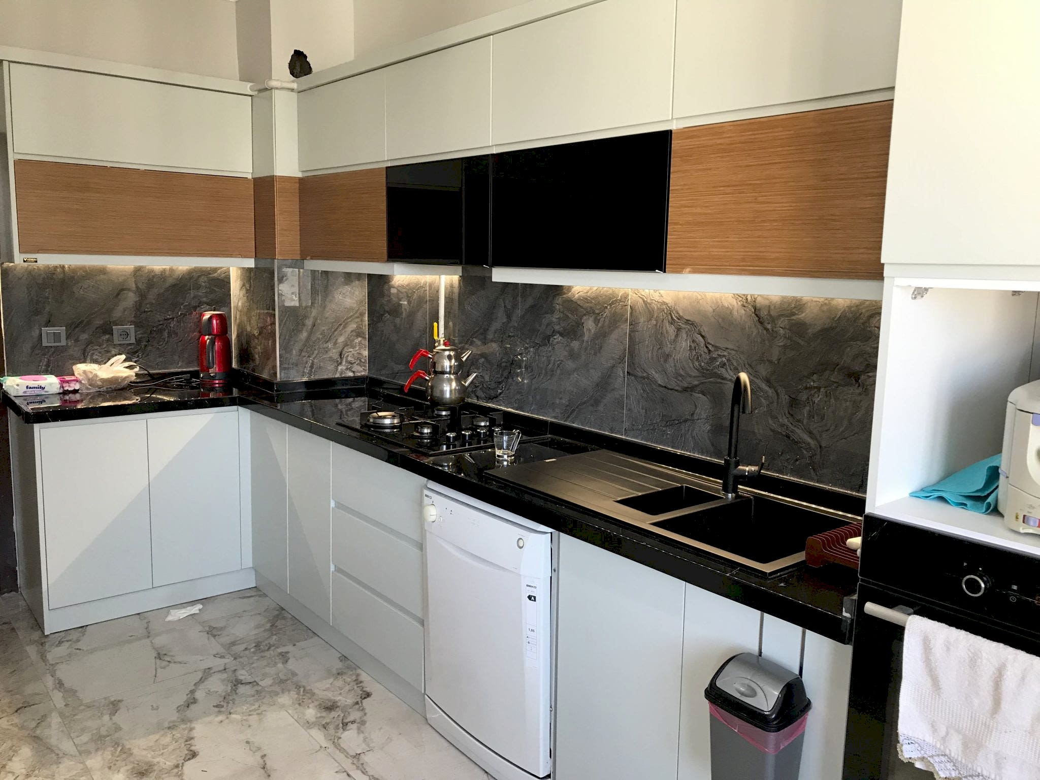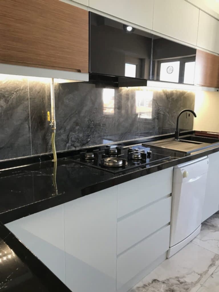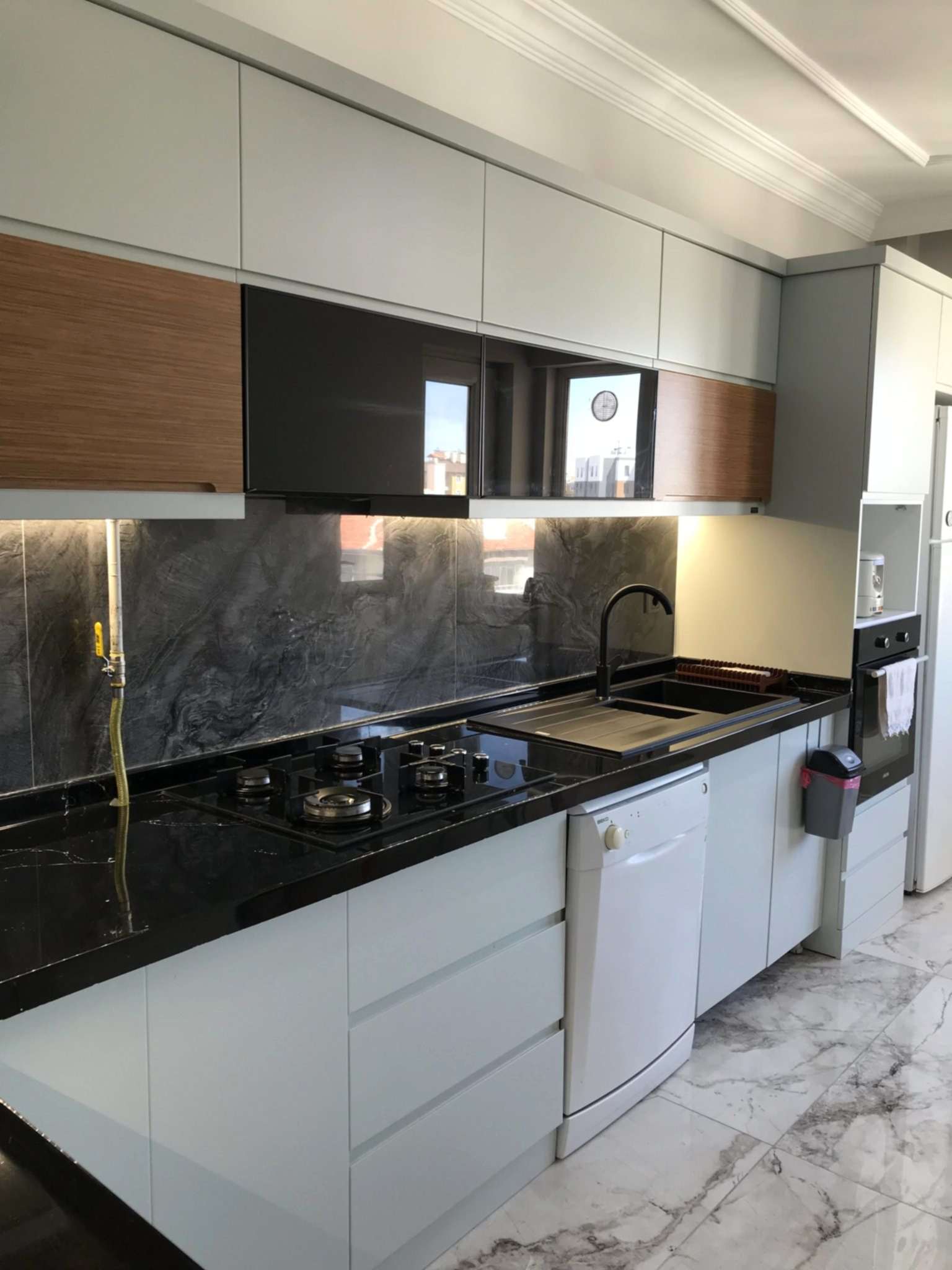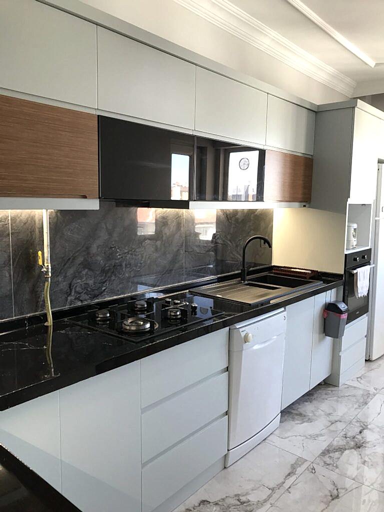 Mutfakta kullanılan MDF gövdeli ve akrilik lake boyalı mutfak dolapları, hem kaliteyi hem de görsel çekiciliği bir arada sunuyor. Koyu renkli mermer mutfak tezgahı, şık ve fonksiyonel mutfak dolaplarının modern çizgileriyle mükemmel bir uyum içinde. Müşterilerimizin günlük kullanım kolaylığı düşünülerek tasarlanan kendinden kulplu kapaklar, zarif bir dokunuş katıyor. Antre ve mutfak zeminlerinde kullanılan büyük ebatlı 60×120 zemin seramikleri, mekana çağdaş ve ferah bir atmosfer kazandırıyor.