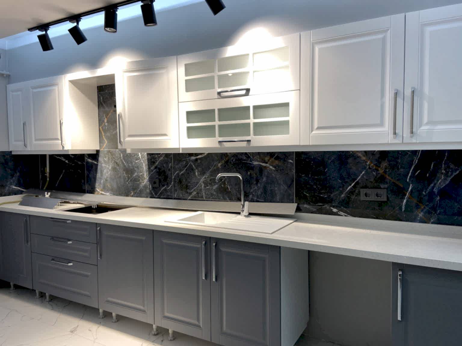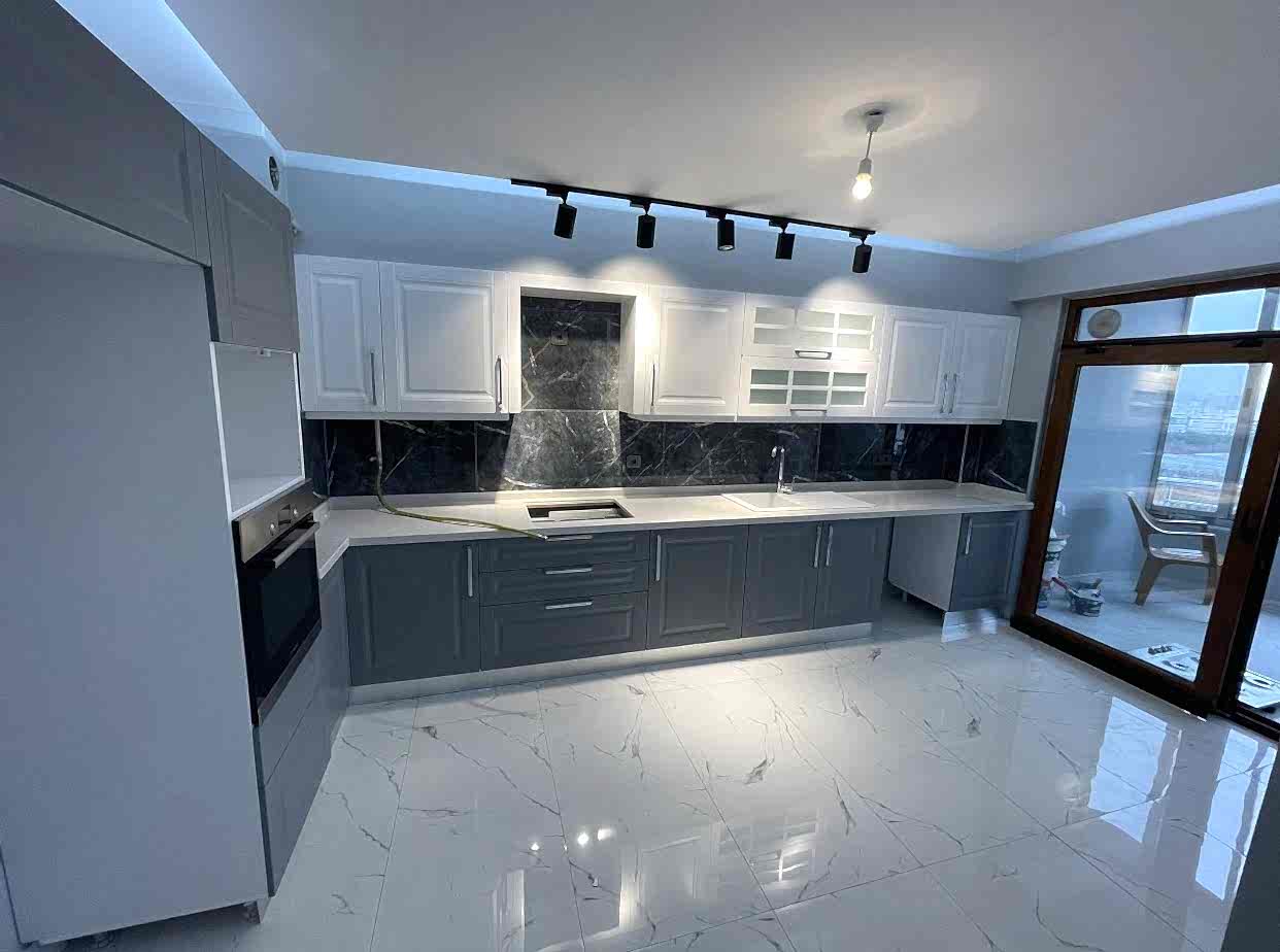Özel Tasarım Mobilyalar ve Detaylar: Raf ölçüleri ve mobilya tasarımları, müşterinin günlük yaşam rutinini göz önünde bulundurarak, özel olarak üretilmiştir. 60×120 ebatlı seramikler ve derzli 10 cm süpürgelik uygulamaları ile zeminler, hem modern hem de şık bir hava kazanmıştır. Antre ve mutfakta kullanılan 10 cm lake süpürgelikler, iç mekan kapılarıyla mükemmel bir uyum içinde tasarlanmıştır.