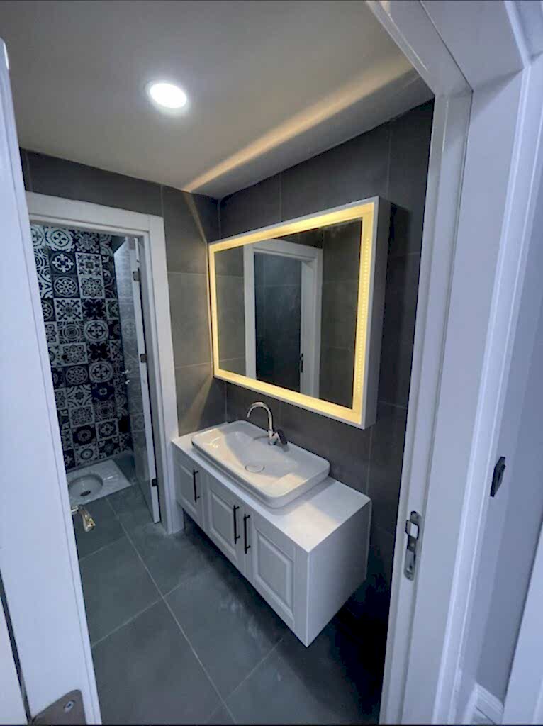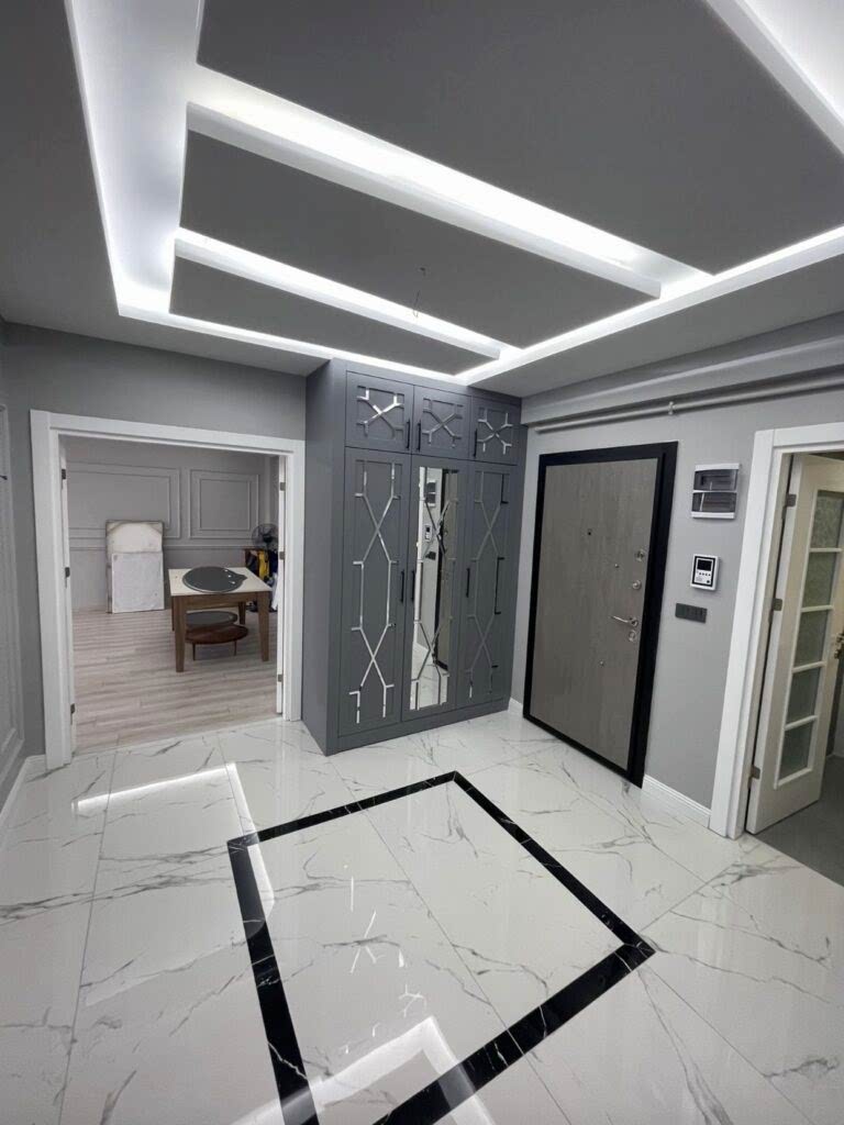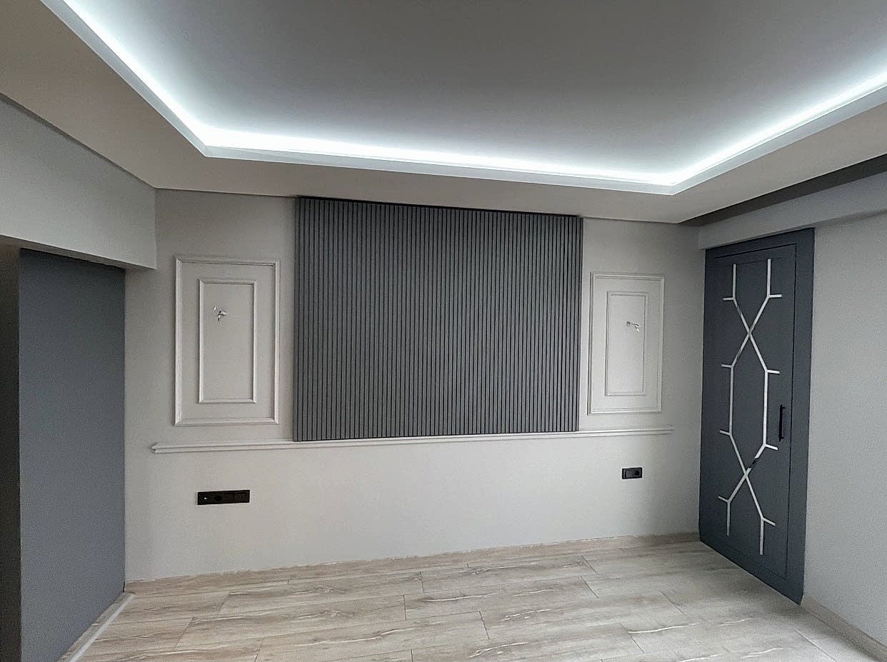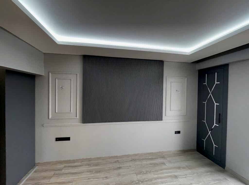 Dekoratif Dokunuşlar: Salon, oturma odası, antre ve mutfakta poliüretan duvar çıtaları ve aplikler, mekânlara zarif bir dokunuş katmıştır. Salonda, yemek masası bölümüne uygulanan dekoratif İtalyan boyası, alana benzersiz bir karakter ve derinlik katmıştır. Mutfak ve kapalı balkon alanları, dekoratif doğal taş uygulamaları ile daha keyifli ve estetik bir görünüme kavuşmuştur.