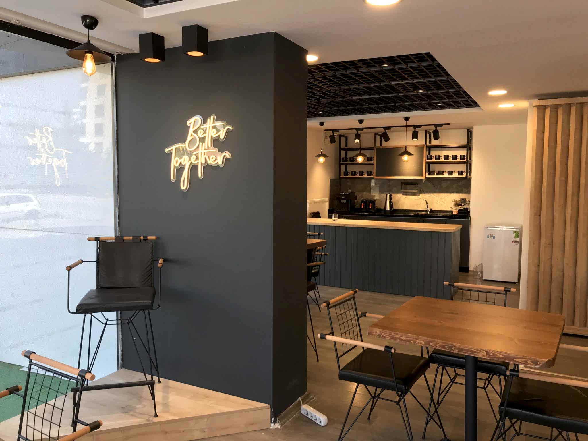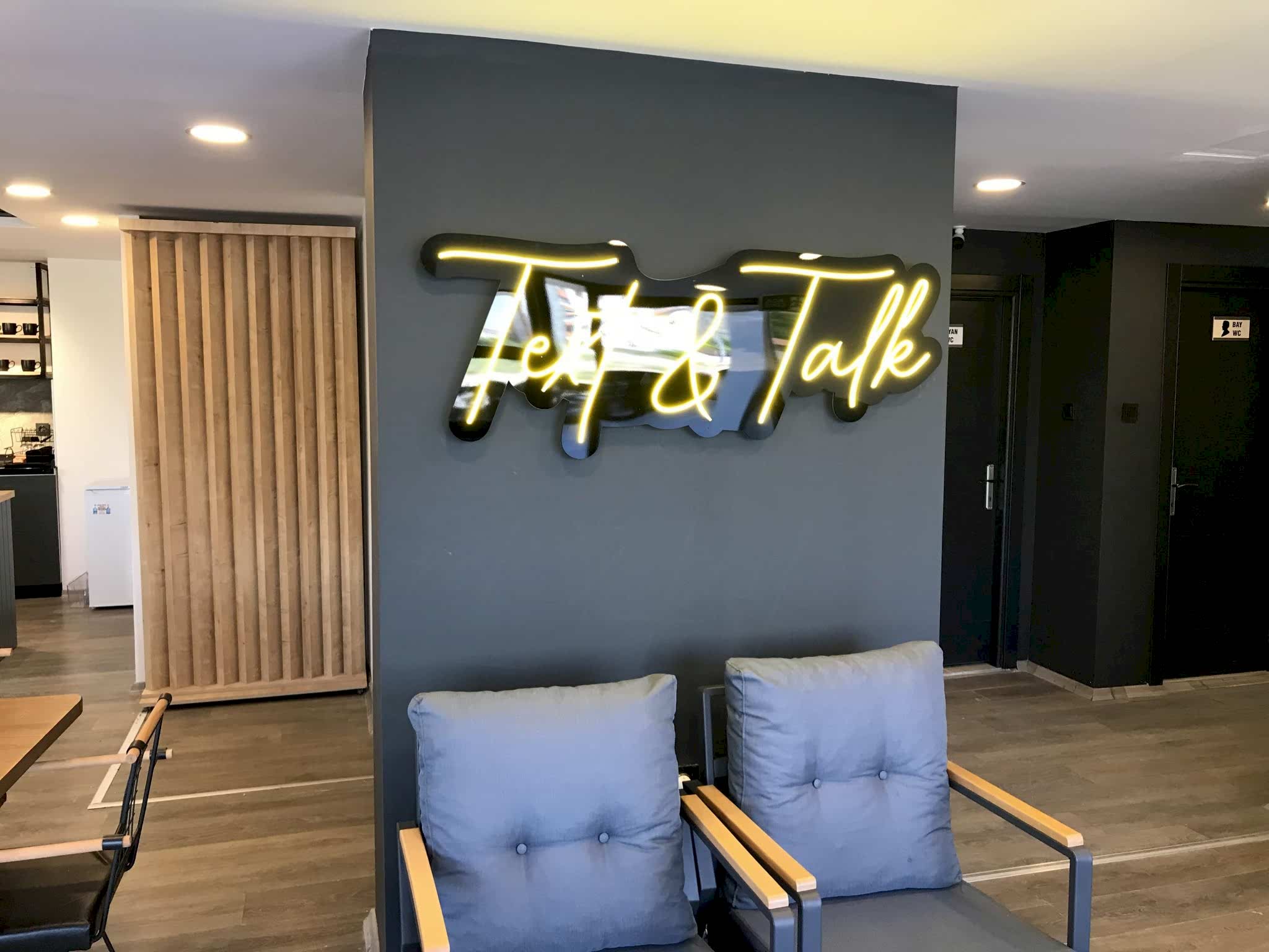Karaoke Alanı ve Neon Yazılar: Cafe, ziyaretçilerine farklı bir deneyim sunmak için tasarlanmış karaoke alanı ile eğlenceyi ve sosyal etkileşimi bir araya getiriyor. Duvarlardaki neon yazılar ise, mekanın dinamik ve genç ruhunu yansıtıyor, ziyaretçilere görsel bir şölen sunuyor.