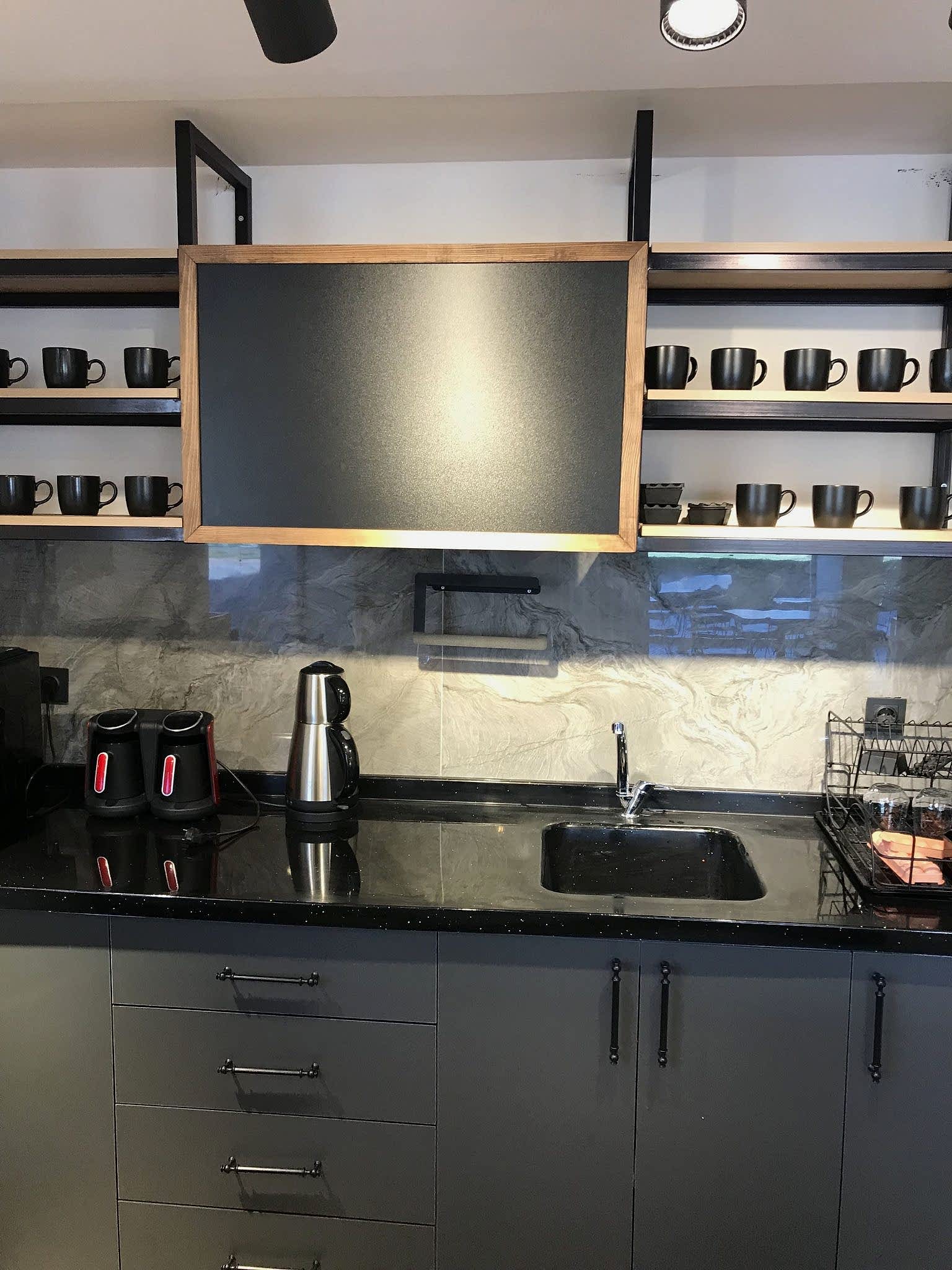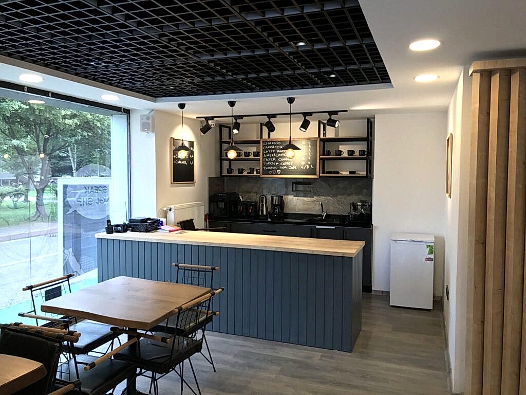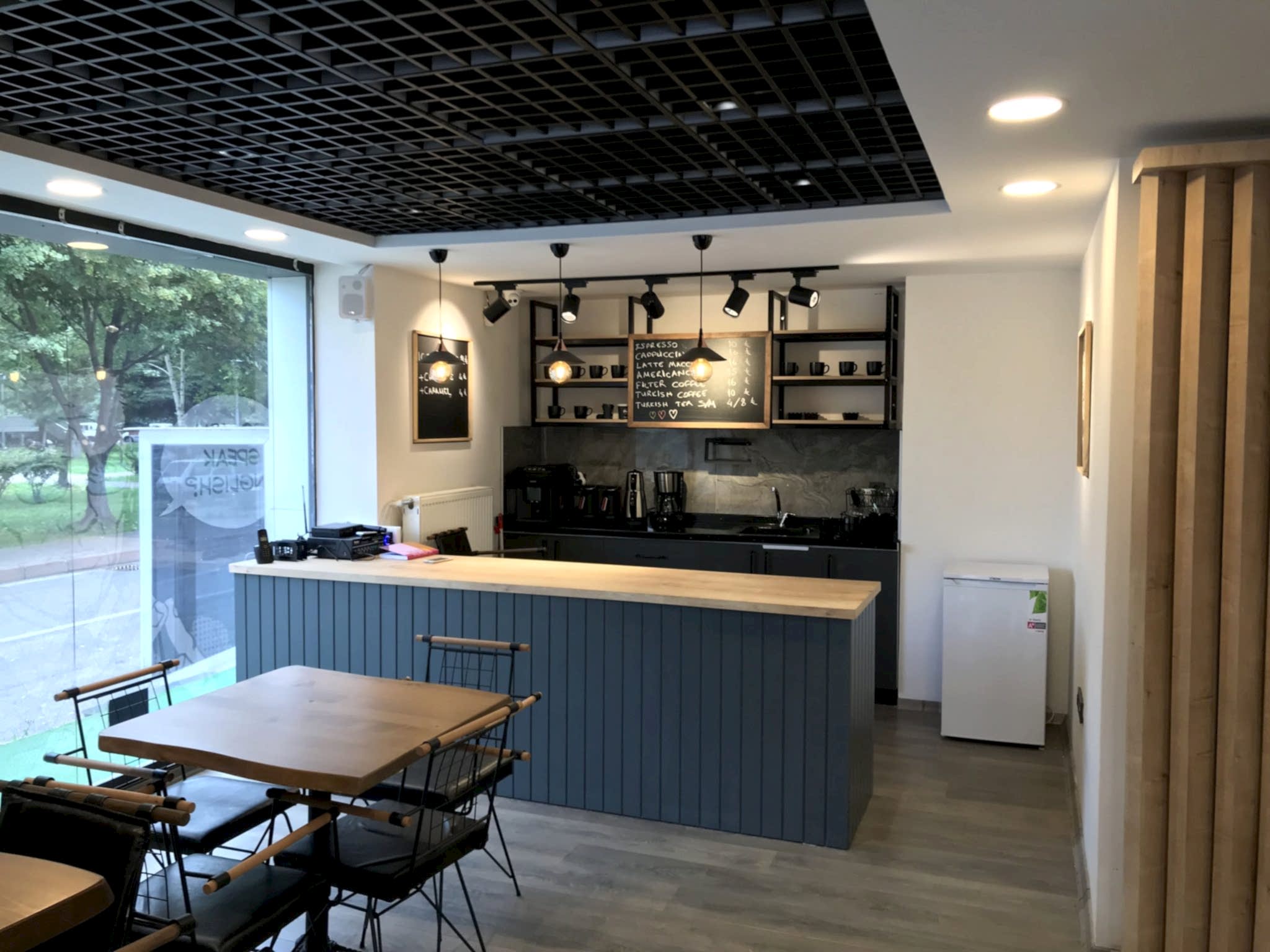 Petek Tavan Uygulaması ve Ses Sistemi Altyapısı: Tavanda kullanılan petek tavan uygulaması, modern ve estetik bir görünüm sağlarken, ses sistemi altyapısı ise müzik ve diğer ses efektlerinin mükemmel bir şekilde dağılımını sağlıyor. Bu özellikler, cafe’nin akustik açıdan ideal bir mekan olmasını sağlıyor.