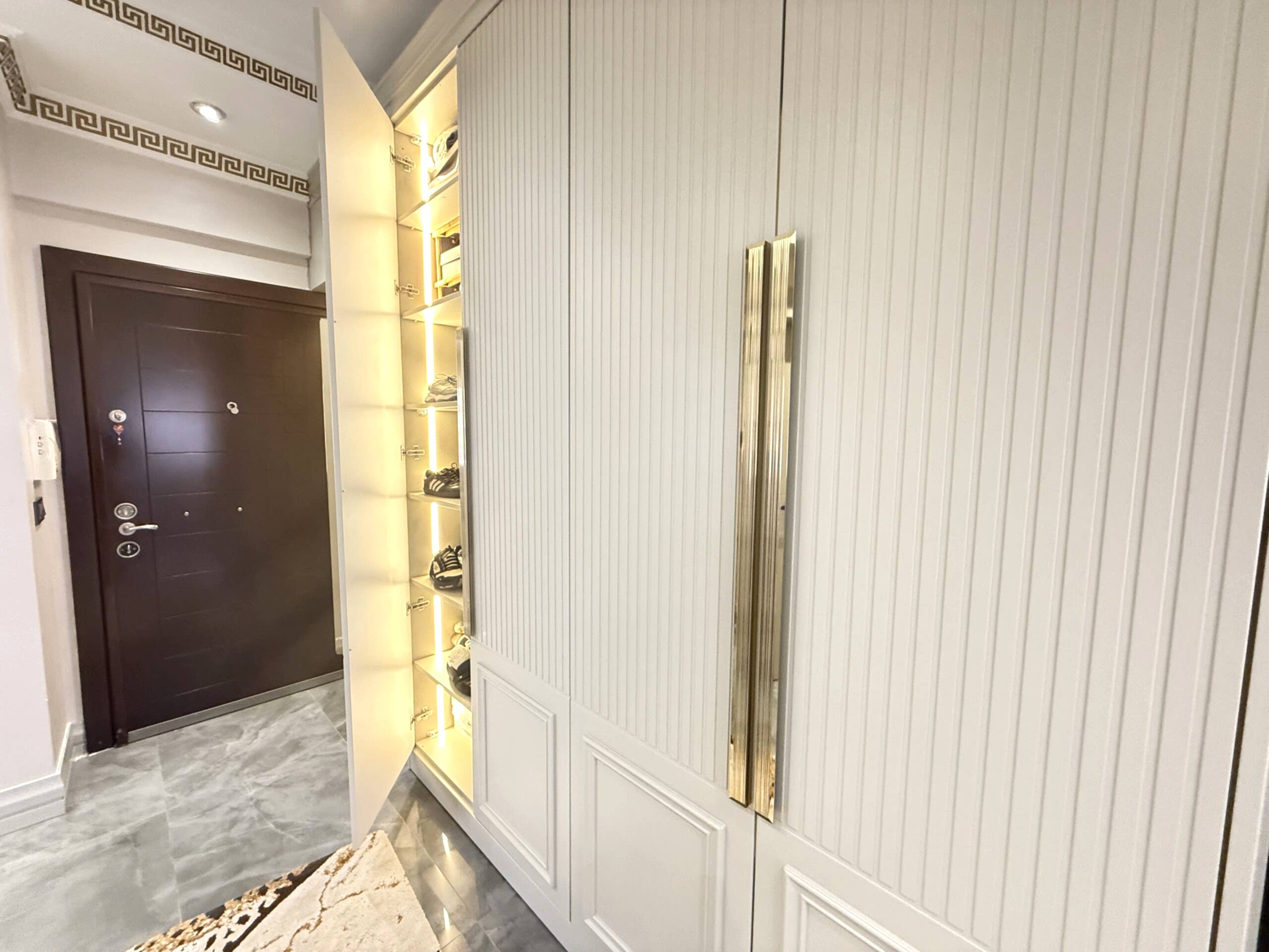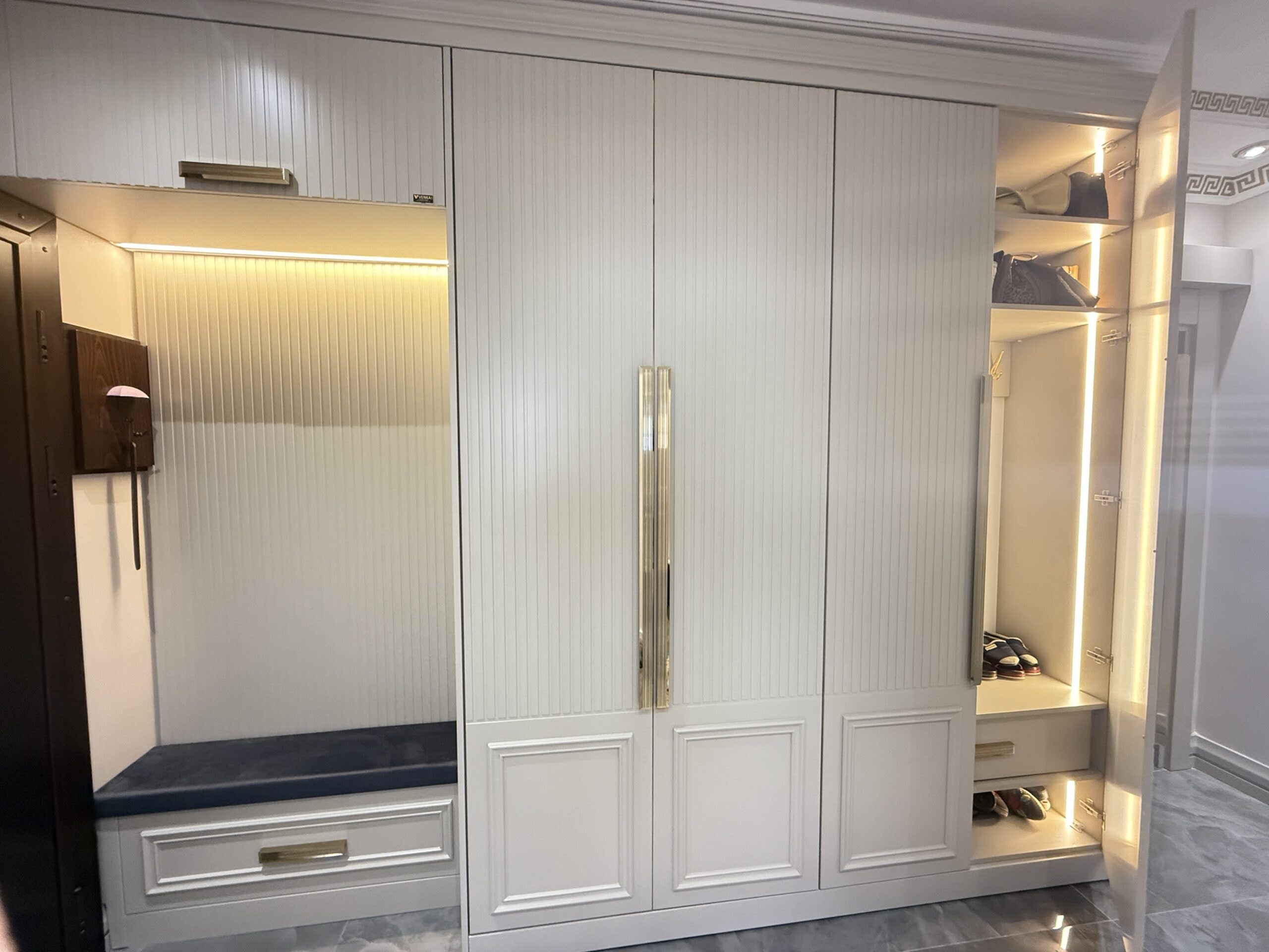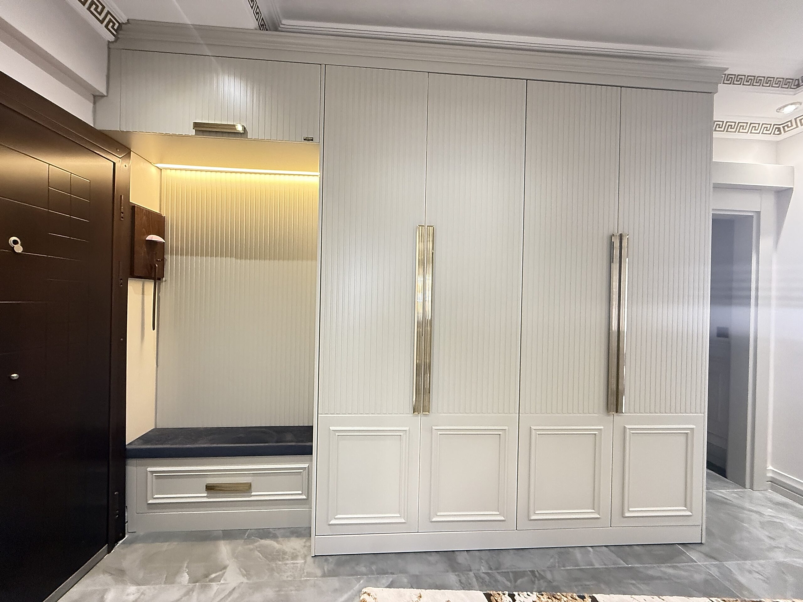 Vestiyer, mekânın çizgisel bütünlüğünü vurgulayan dikey panel kapakları ve zarif hatlarıyla öne çıkıyor. Kullanılan altın detaylı modern kulplar, sade tasarıma şıklık katarken mekânın değerini artırıyor. Kapakların alt kısmında uygulanan klasik çerçeve paneller ise tasarıma zarif bir dokunuş kazandırdı.